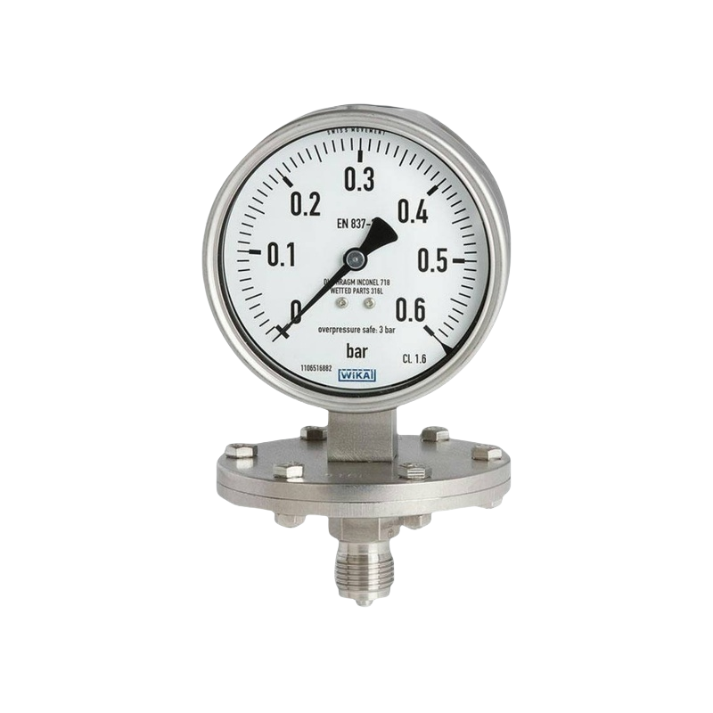 隔膜式压力表更适用于低压测量。通过大工作表面的圆形、波纹膜片元件,可以可靠地测量小压力范围。 不锈钢制外壳和接液部件满足抗侵蚀性介质的高要求。对于特别高的阻力要求,压力腔体可采用多种特殊材料设计,如聚四氟乙烯、钽或哈氏合金。 对于高粘性、结晶或受污染介质的测量,建议使用敞开式连接法兰。与螺纹连接相比,敞开式连接法兰具有压力端口不会堵塞的优点。敞开式连接法兰上有附加的冲洗连接,可以很容易地清洗压力腔体。 从设计上看,带有隔膜元件的测量系统提供了很好的过压保护,因为隔膜可以获得上法兰的支撑作用。作为标准配置,这种隔膜式压力表可达到满量程值5倍的过载保护。作为可选项,可以实现更高的过载低风险要求。
