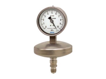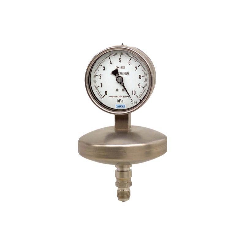 介质腔和参考气室之间的压力差导致隔膜元件的偏转,从而产生测量行程。隔膜元件的测量行程通过连杆由金属波纹管传递给机芯,并通过仪表指针显示在表盘上。